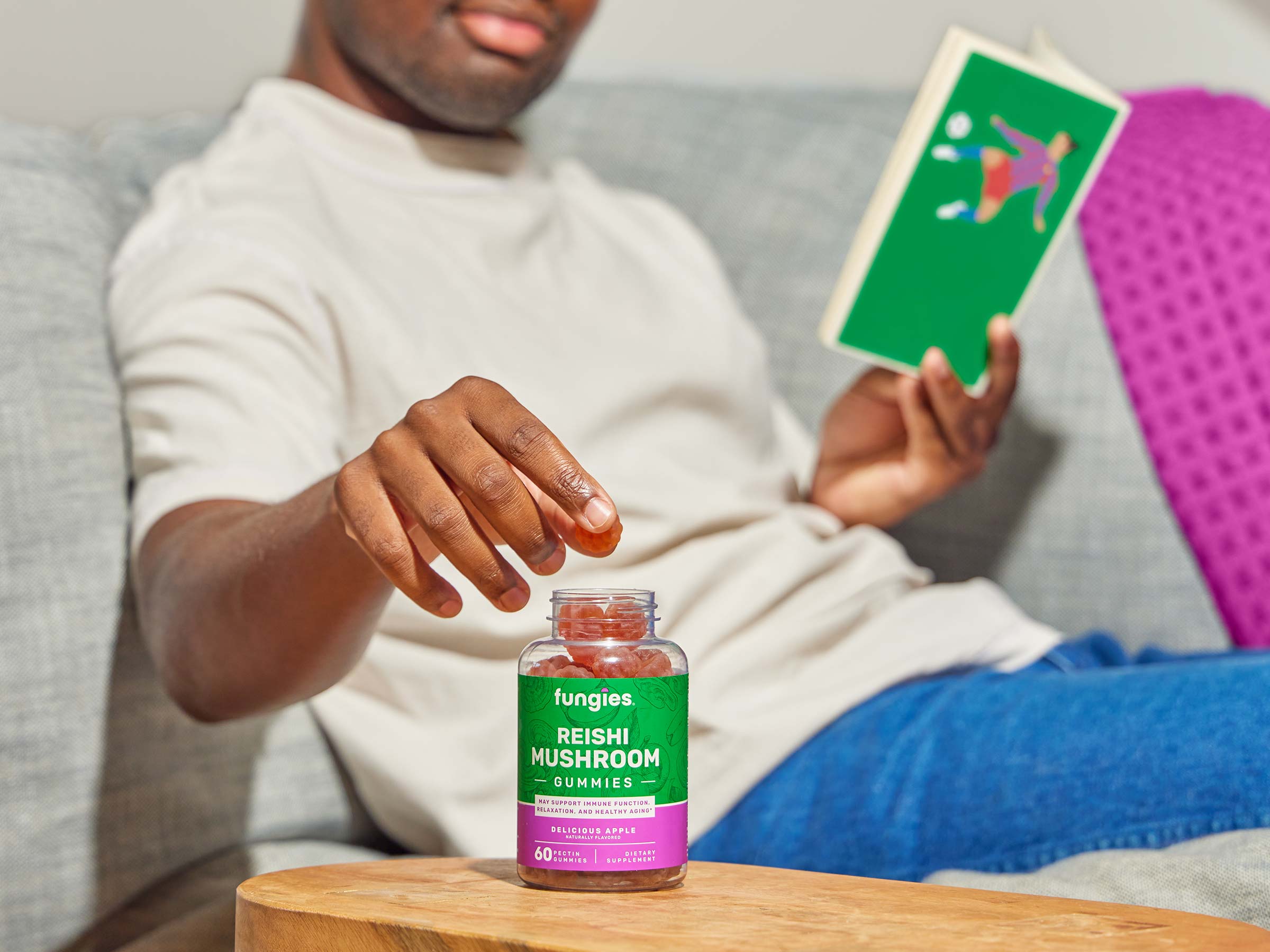 Reishi Mushroom Gummies (60 Count) bottle featuring a label, highlighting vegan and gluten-free attributes, containing 500mg Reishi mushroom extract per gummy for wellness. Man holding a jar of Reishi Mushroom Gummies (60 Count) on a couch, showcasing the product's focus on wellness and flavor. Reishi Mushroom Gummies (60 Count) with a hand holding a gummy near a bottle, ideal for daily wellness with 500mg Reishi extract, apple flavor. Reishi Mushroom Gummies (60 Count) jar sits on a table, surrounded by snacks and drinks, highlighting their wellness focus in a social setting. Hand reaching for a jar labeled Reishi Mushroom Gummies (60 Count), next to a bowl of gummies, emphasizing their apple flavor and wellness benefits.